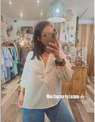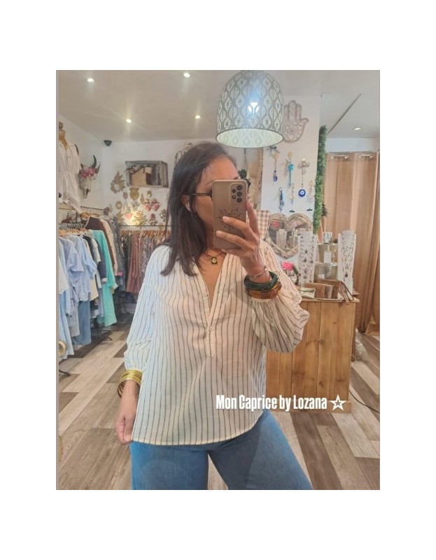 Optez pour un look élégant et facile à porter avec cette chemise blanc cassé â rayures vertes disponible aussi en marron .