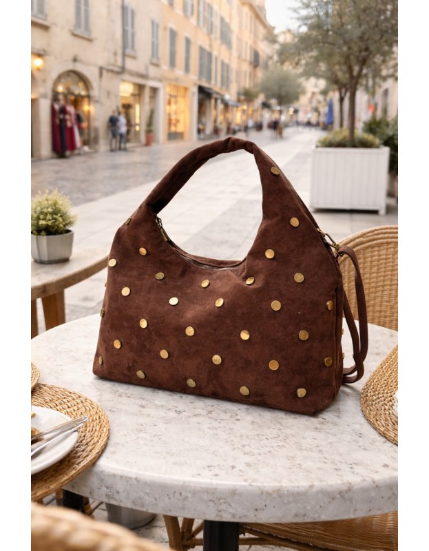 Sac à main marron à clous dorés en matière effet suédine, doté d’une anse épaule et d’une bandoulière amovible. Chic, tendance et pratique, il complète parfaitement vos tenues du quotidien, du look casual au style plus sophistiqué.