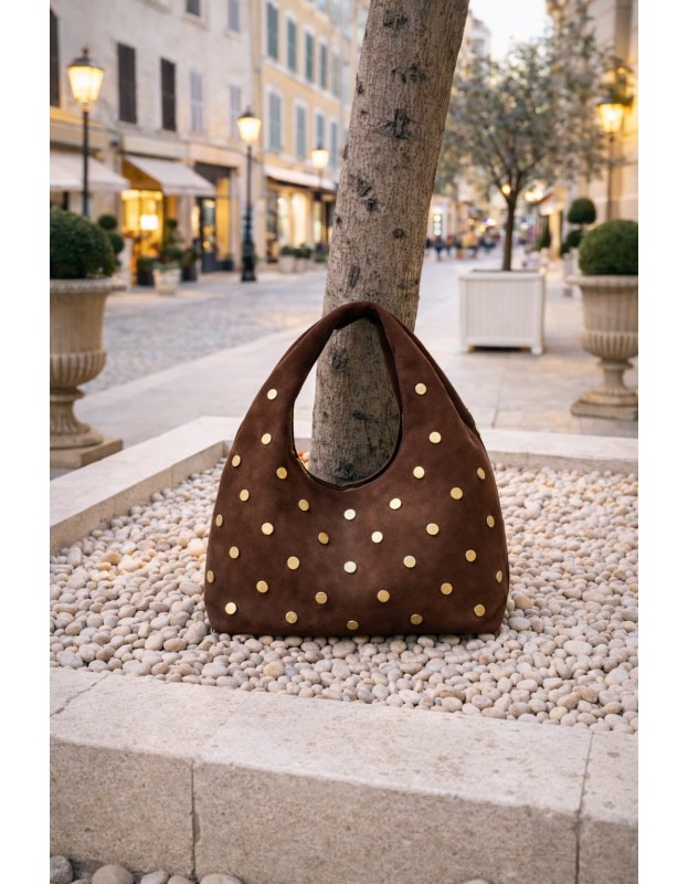 Sac à main marron à clous dorés en matière effet suédine, doté d’une forme hobo élégante et d’une anse confortable pour un porté épaule. Chic, tendance et pratique, il sublime vos tenues du quotidien avec une touche moderne et féminine.