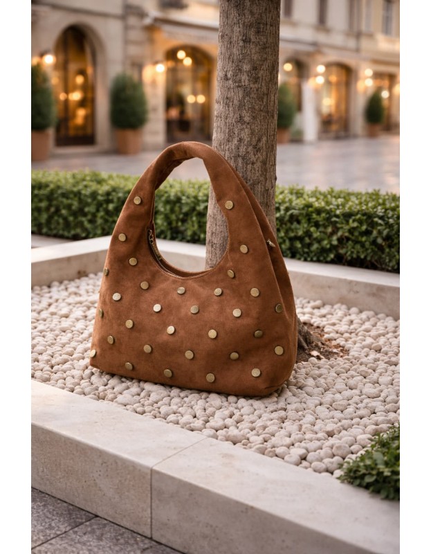 Petit sac hobo marron camel à clous dorés en matière effet suédine, doté d’une anse confortable pour un porté épaule élégant. Compact, chic et tendance, il est idéal pour transporter vos essentiels avec style.