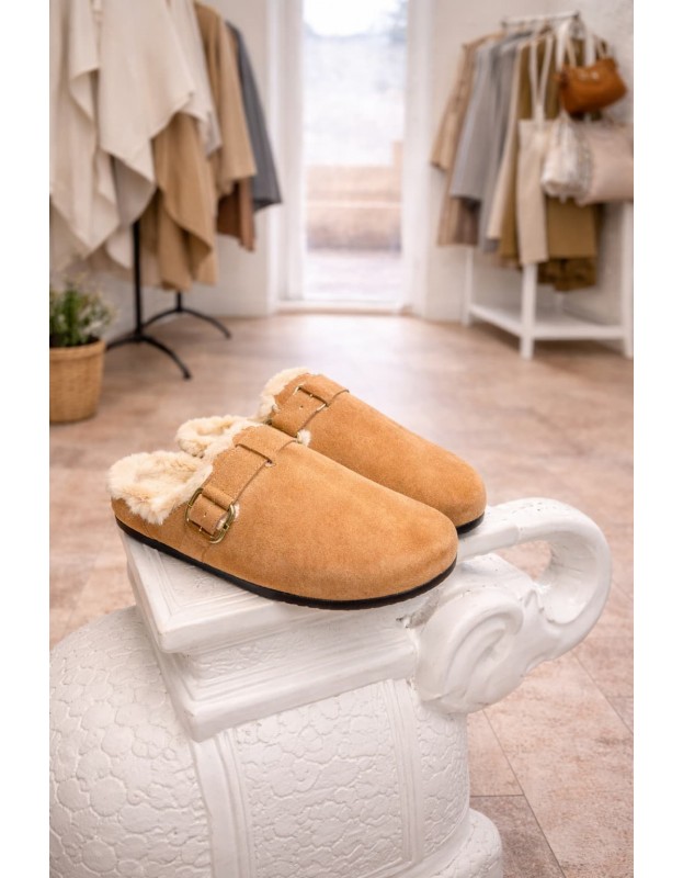 Claquettes fourrées camel effet suédine avec doublure en fausse fourrure et bride à boucle dorée. Confortables, chaudes et tendance, idéales pour un style cosy en automne-hiver.
