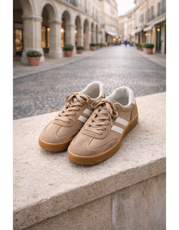 Baskets marron et beige effet suédine avec bandes blanches contrastantes et semelle gomme camel confortable. Rétro et faciles à associer, idéales pour un look casual chic tendance au quotidien.