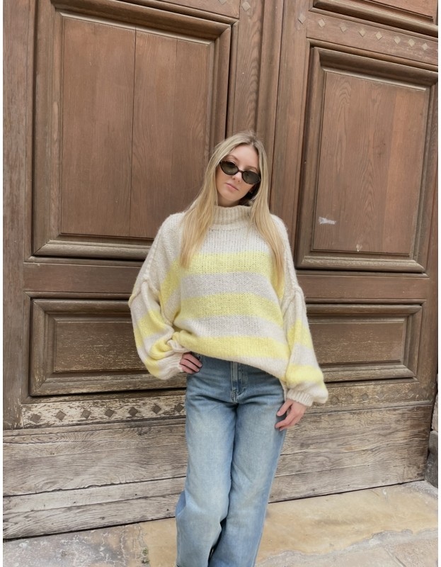 Pull crème à rayures jaunes en maille douce et confortable